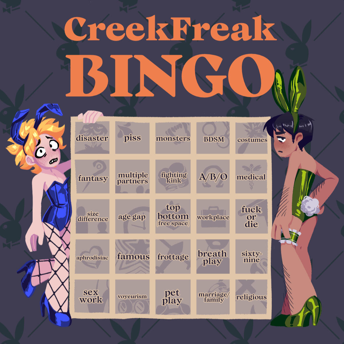 Creek Freak Bingo is an NSFW event that will take place from October 28th to November 3rd.There will be a bingo card with 25 kinks, AUs, tropes, and sex acts. Participants will post work (art or fics!) that include these prompts in order to cross off bingo squares, and try to get a bingo!